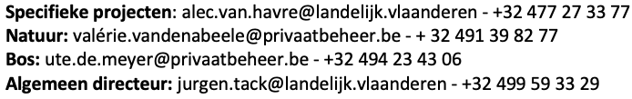 - Alle kantoren van de Bosgroepen zijn gesloten, maar je kan hen nog steeds telefonisch en via e-mail bereiken. Noodzakelijk terreinwerk blijven ze voorlopig doen, uiteraard alleen en met respect voor alle regels. Afspraken met boseigenaars zijn voorlopig uitgesteld.